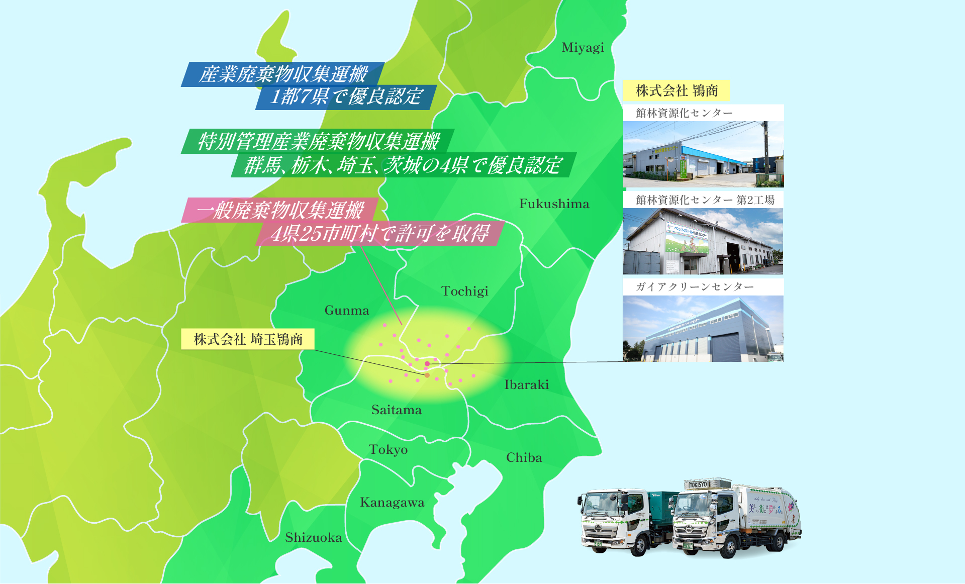 群馬、栃木、埼玉、茨城の4県では、さらに要件の厳しい特別管理産業廃棄物収集運搬業の優良認定を取得。